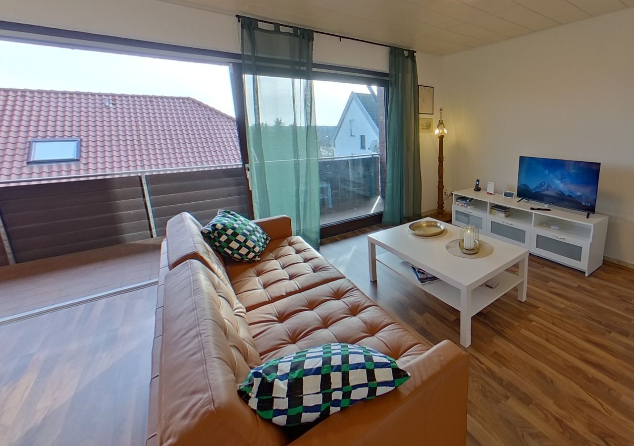 Das Apartment Das Apartment ist auf Licht, Komfort und ein großzügiges Raumgefühl ausgelegt und erstreckt sich über zwei Ebenen. Die oberen Wohnbereiche bieten einen beeindruckenden Blick über die Münsterländer Landschaft, während die Schlafzimmer auf Gartenebene angenehm kühl und ruhig bleiben. Obere Ebene – Der Mittelpunkt des Zusammenlebens Wohnbereich: Ein heller, offener Raum mit 45 m² und elegantem, neuem Nussbaum-Laminatboden. Freuen Sie sich auf ein großes, gemütliches Sofa, das sich ...