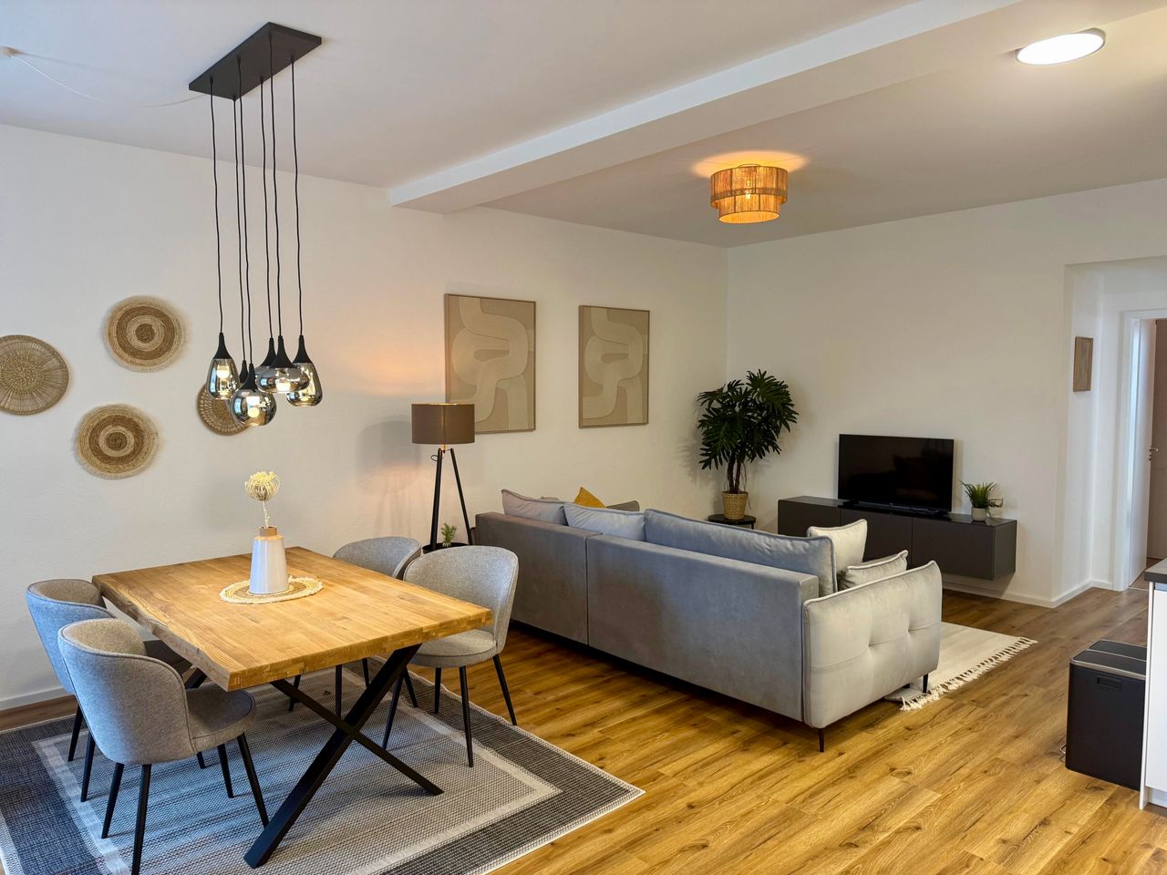 Schöne 2-Zimmer-Wohnung, Neubau mit Innenhof und Terrasse (Aussenbereich derzeit noch in Bau, Terrasse und Außenbereich werden im Winter fertiggestellt), Wohnzimmer mit Schlafsofa, Schlafzimmer, hochwertige Einbauküche, hochwertiges Bad. Vollausgestattet inkl. Parkplatz und Internet/Wlan/Smart-TV, inkl. Strom.