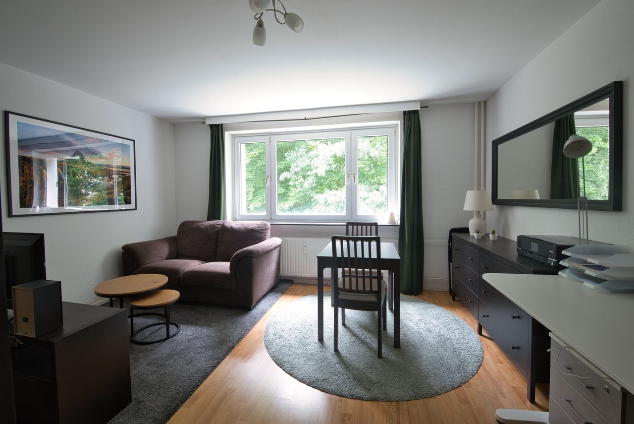 Komplett möblierte 1-Zimmer-Wohnung in Hamburg-Eidelstedt. Die Wohnung ist ca. 35,2 qm groß und hat einen Laminatboden. Sie liegt in der 2. Etage eines Mehrfamilienhauses. Das Wohn-/Schlafzimmer ist vollständig eingerichtet mit einem Sofa, zwei Couchtischen und einem Smart-TV, 32". Ein Schreibtisch mit Drehstuhl für die Arbeit im Home-Office und ein Kleiderschrank stehen ebenso zur Verfügung. Ein ausziehbarer Esstisch bietet Platz für bis zu 4 Personen. Ein gemütliches Bett (140cmx200cm) ist vo...