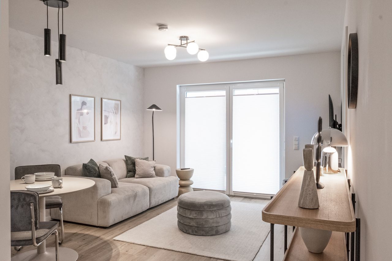 Willkommen in Ihrer neuen, stilvoll möblierten Neubauwohnung, die höchsten Wohnkomfort und moderne Ausstattung vereint. Die barrierefreie Wohnung bietet Ihnen alles, was Sie brauchen, um sich sofort wie zuhause zu fühlen. Genießen Sie sonnige Stunden auf dem großzügigen Balkon oder kochen Sie in der voll ausgestatteten Küche, die keine Wünsche offenlässt. Auch an praktischen Details fehlt es nicht: Ein eigener Waschtrockner in der Wohnung sorgt für zusätzlichen Komfort. Zwei moderne Flachbildfe...
