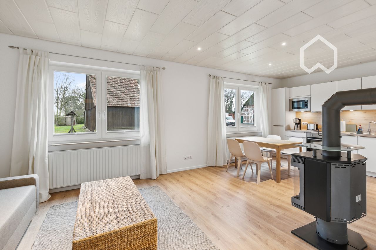 Wir bieten Ihnen eine wunderschöne möblierte Wohnung in einem alten denkmalgeschützten Bauernhaus in Hamburg. Beschreibung der Wohnung: Die geräumige Wohnung befindet sich im Erdgeschoss. Ein großzügiger Flur heißt Sie beim Betreten willkommen. Die frisch sanierte und komplett neu eingerichtete, voll ausgestattete Wohnküche ist das Herzstück der Wohnung. Das Schlafzimmer verfügt über ein gemütliches 1,40m Bett und einen Fernseher, ideal für entspannte Abende. Besonderheiten: - Historisches Ba...