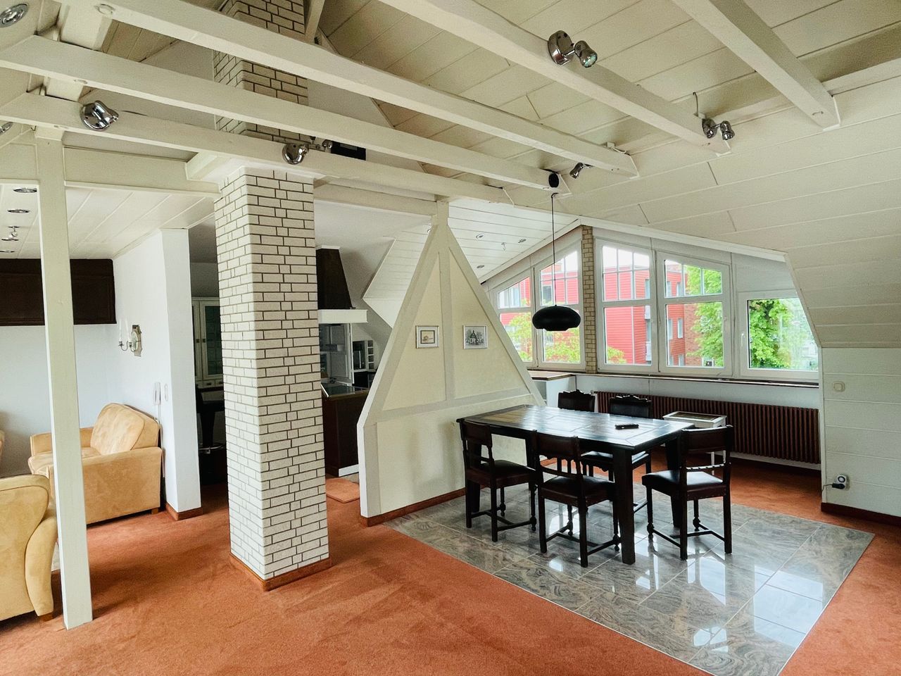 Die elegante und gepflegte Wohnung befindet sich in der ersten und zweiten Etage eines schönen Zweiparteienhauses mit heller Kalksandsteinfassade. Die Wohnung ist ruhig, da die Parterrewohnung nur ab und zu an den Wochenenden von den Eigentümern benutzt wird. Das stilvoll eingerichtete Dachgeschoss besteht aus einem großen Ess– und Wohnraum mit Balkonaustritt und einer kompletten Einbauküche in Weiß mit Spülmaschine, Herd, Backofen, Mikrowelle, Kühl- und Gefrierschrank sowie Spüle mit Kalt- Wa...