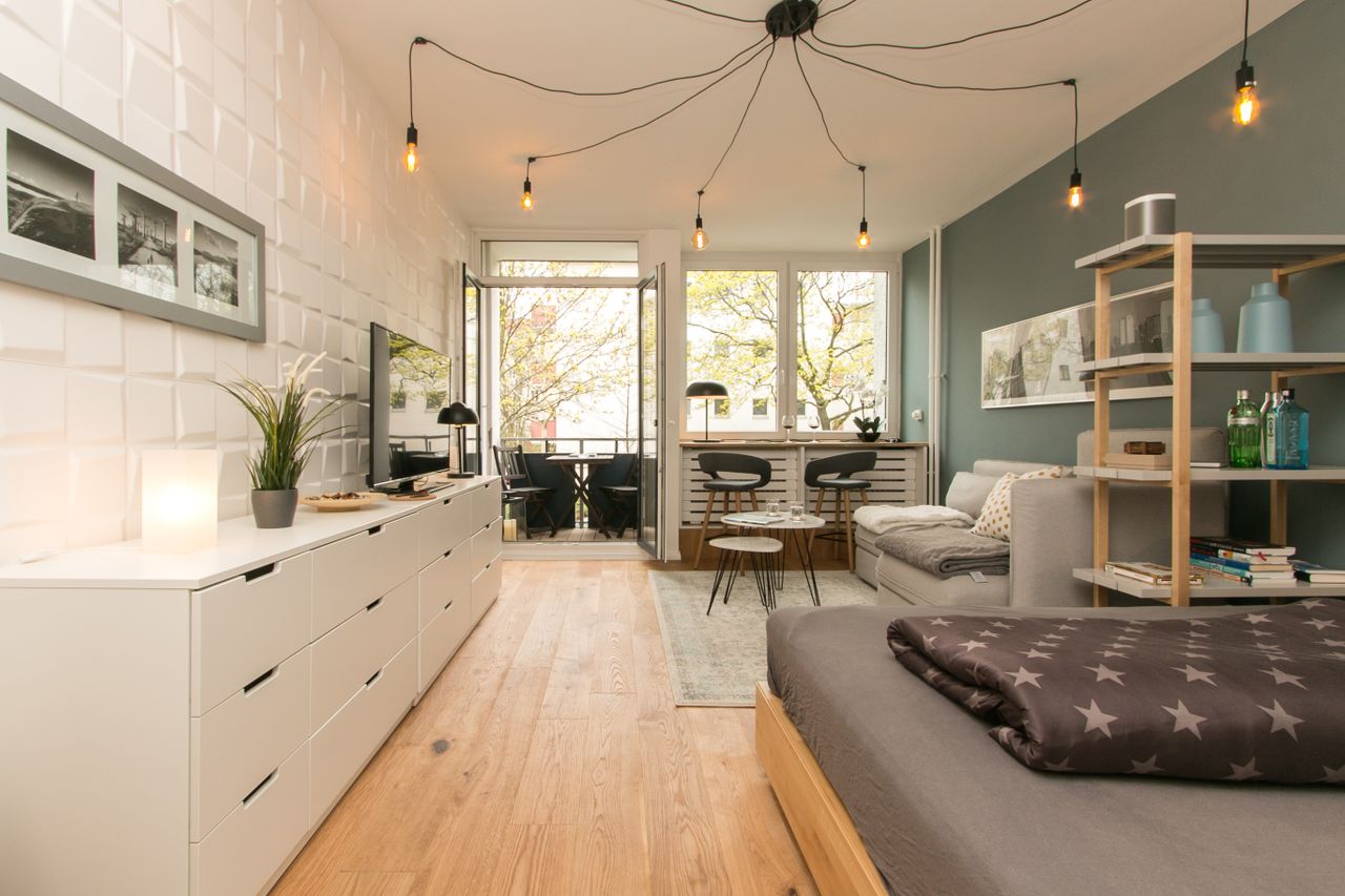 Die Wohnung ist in 2019 neu renoviert und modern eingerichtet. Parkettboden, gespachtelte Wände und moderne Lampen und Deckenfluter sorgen für eine behagliche Wohnatmosphäre. Schränke und der Abstellraum bieten ausreichenden Stauraum. Das geschmackvoll eingerichtete Zimmer beherbergt neben einem Qualitätsbett auch ein Sofa, ein Arbeits-/Esstisch mit 2 Stühlen, ein Sideboard sowie einen Fernseher mit Internetanschluss und einem FireTV. Internet (WLAN) ist in der Wohnung vorhanden. In der Küch...