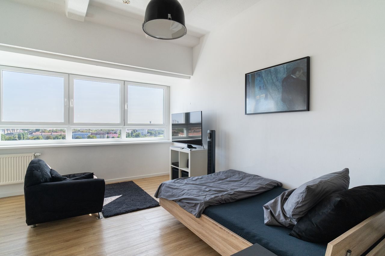 Dieses moderne und stilvoll eingerichtete Studio-Apartment bietet auf 35 Quadratmetern eine ideale Wohnlösung in einer zentralen Lage Berlins. Das Apartment befindet sich in der 9. Etage eines gepflegten Hochhauses und bietet einen beeindruckenden Ausblick über die Stadt, den Sie von den großen Fenstern aus genießen können. Der Wohn- und Schlafbereich ist offen und hell gestaltet, wobei die moderne Einrichtung und die durchdachten Details für ein angenehmes Wohnambiente sorgen. Die große Fenste...