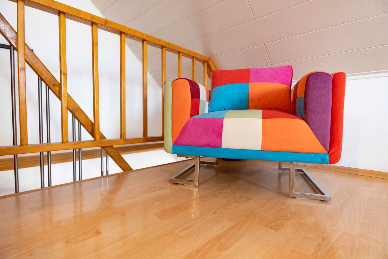 Charmante, zweistöckige Wohnung mit Mansarden-Schlafzimmer, liebevoll eingerichtet mit Parkettboden, allerlei Bildern und teils antiken Möbeln. Das untere Stockwerk befindet sich im ersten Stock und ist durch eine Außentreppe zugänglich, im unteren Stockwerk befinden sich Wohnzimmer, Küche und ein zweites WC. Durch eine Innentreppe geht es dann rauf zu Schlafzimmer und Bad/Dusche. In der Nähe liegen: Landshut, Dingolfing, Ohu, Straubing, Landau Die Treppe ins Mansarden-Schlafzimmer ist relativ...