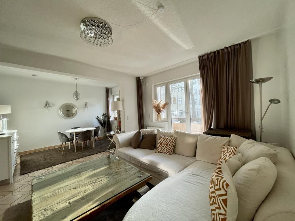 Diese liebevolle, helle 3-Zimmer Hochparterre-Wohnung bietet alles, was man zum Wohlfühlen braucht: Ein Schlafzimmer mit Doppelbett und einem großen Kleiderschrank. Ein Gäste- bzw. Arbeitszimmer mit einem Einzelbett. Ein großes, helles Wohnzimmer mit Essbereich und einem Tisch für 4-6 Personen sowie mit einem großen Couchbereich am Kamin. Von dort gelangt man hinaus auf einen kleinen Balkon mit Süd-West-Ausrichtung. Die Küche ist mit Ceran-Kochfeld, Kühl- und Gefrierschrank, Backofen, Mikrowelle...