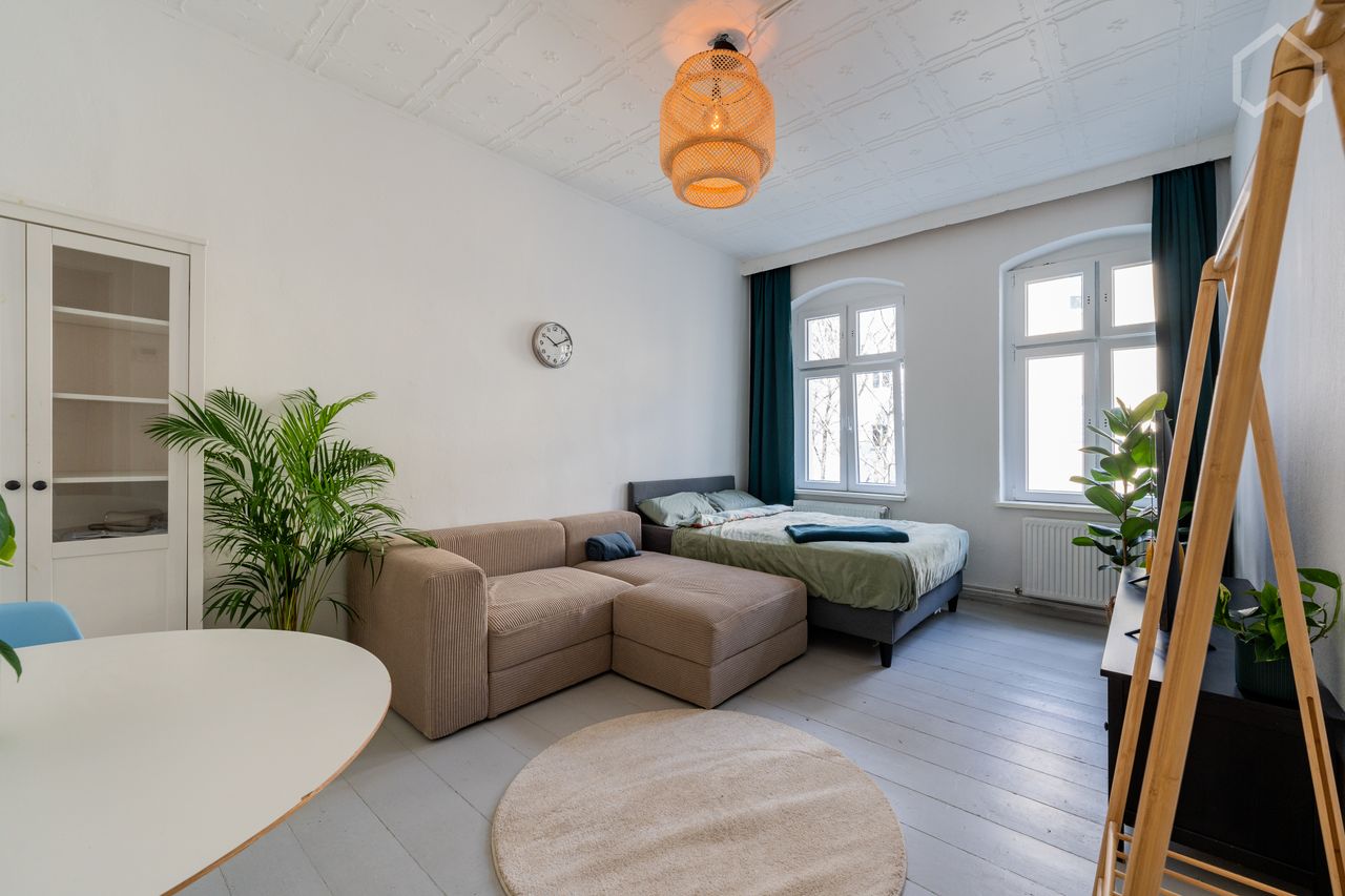 Willkommen in Ihrem neuen Zuhause auf Zeit! Diese geschmackvoll eingerichtete 1-Zimmer Wohnung im lebendigen Samariter Kiez in Berlin Friedrichshain bietet Ihnen ein helles und großzügiges Wohn-Schlafzimmer zum Wohlfühlen. Genießen Sie gemütliche Abende auf dem komfortablen Eck-Sofa oder entspannen Sie im großzügigen Doppelbett, während Sie Ihre Lieblingssendungen auf dem großen TV verfolgen. Der Esstisch mit 2 Stühlen lädt zu gemeinsamen Mahlzeiten oder Arbeitsstunden ein. Das weiß geflieste ...