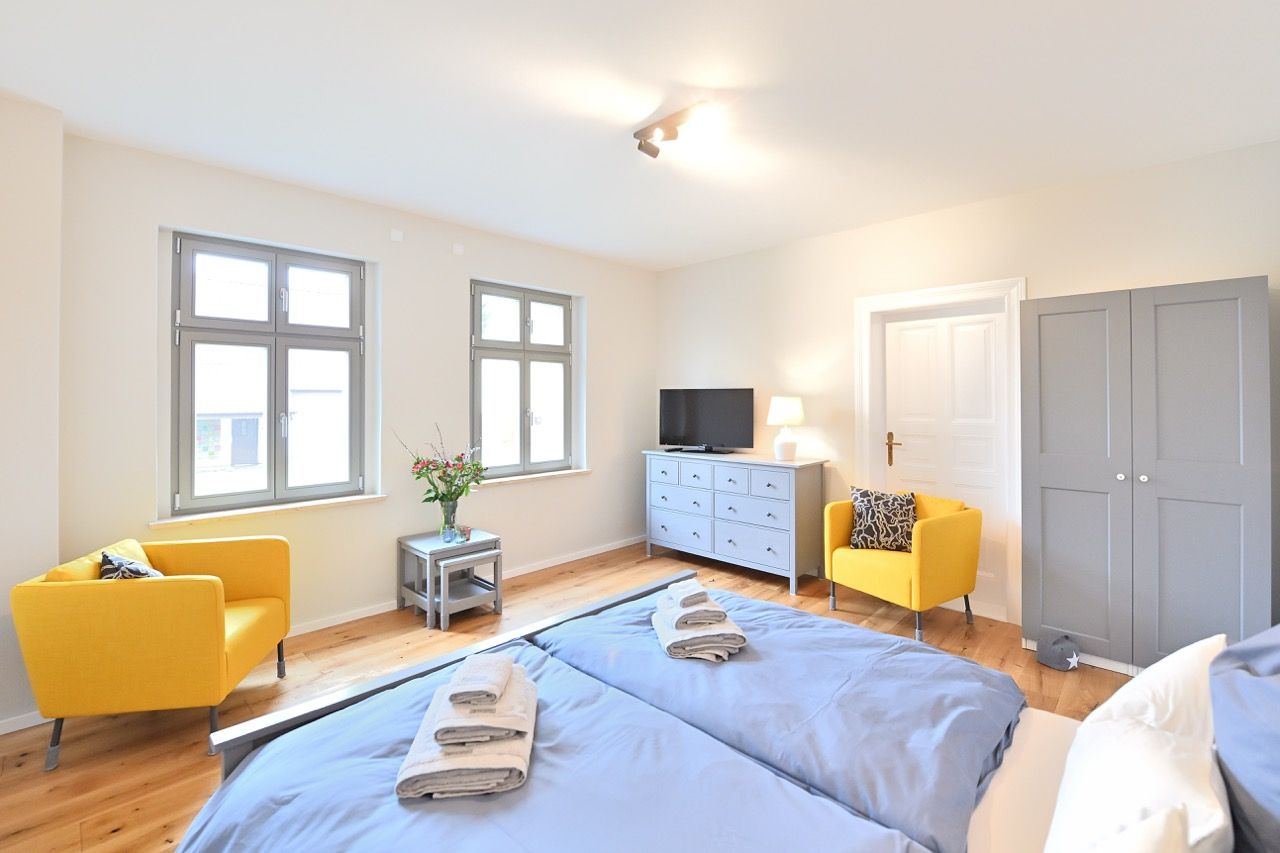 Die kleine gemütliche 1-Zimmer-Wohnung befindet sich im Erdgeschoss (Hochparterre) unseres Vorderhauses und bietet ein Wohn- bzw. Schlafzimmer, eine Küche samt kleinen Essbereich sowie ein Duschbad. Das große Zimmer ist zur Straße ausgerichet und ist mit einen Schlaf- und Sitzmöbeln ausgestattet. Das Doppelbett ist 1,60m breit und natürlich ist der Raum mit Kleiderschränken und Ablagemöglichkeiten ausgestattet. Die Einbauküche ist voll ausgestattet und hält mit Besteck, Geschirr, Kochutensilie...