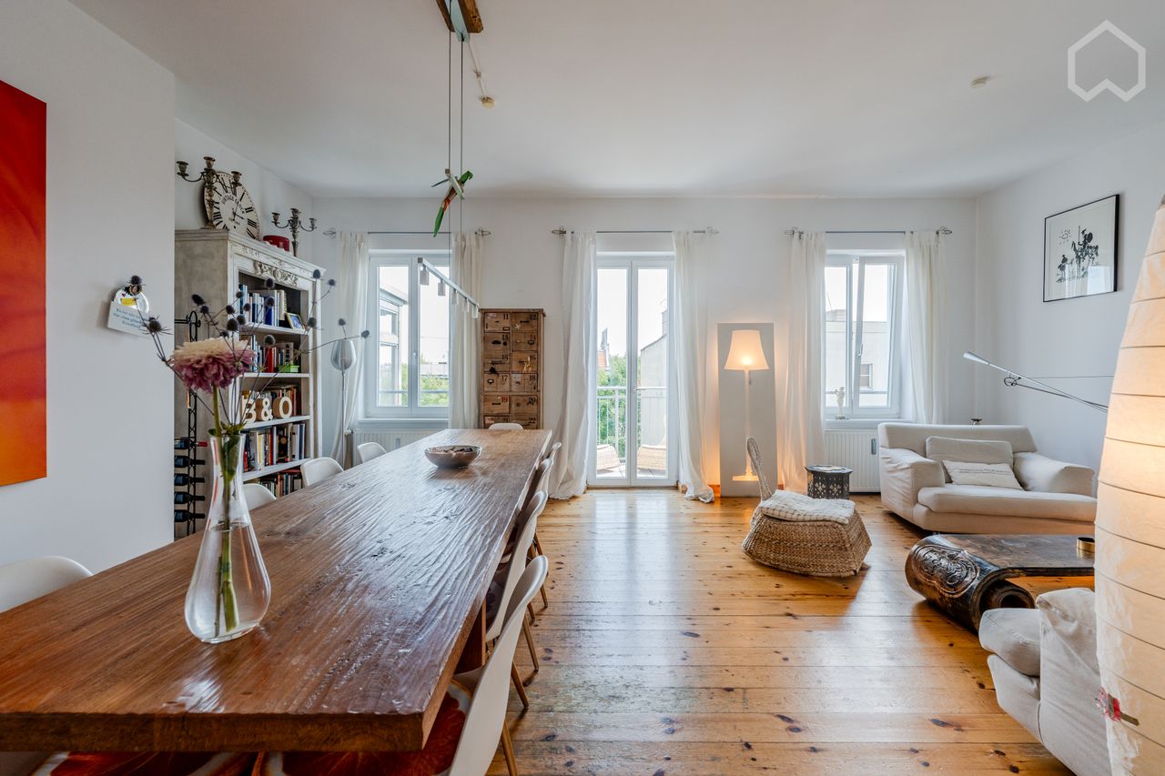 Sonniges und ruhiges 180qm Penthouse mitten in Prenzlauer Berg (zwischen Helmholtzplatz, Kollwitzplatz und Kulturbrauerei). Von Berliner Ehepaar mit ausgefallenen Möbeln und Kunst eingerichtet. Genießen Sie das 49 Quadratmeter große Wohnzimmer, das 37 Quadratmeter große Esszimmer und das 24 Quadratmeter große Hauptschlafzimmer. Sie haben zwei moderne Badezimmer, eine große Küche und ein Zimmer für zwei Kinder oder Gäste, drei Balkone und eine große Dachterrasse mit 360° Blick über die Dächer bi...