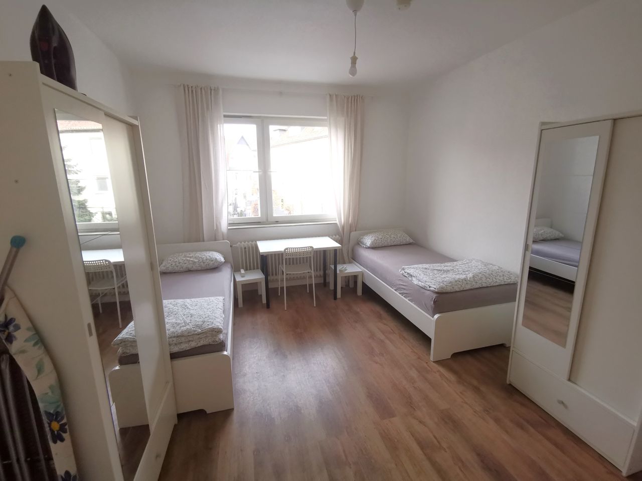 Hallo, Die 3-Zimmer Wohnung ist mit einer voll ausgestatteten Küche eingerichtet, inklusive Induktionskochfeld, Waschmaschine, Spülmaschine sowie Geschirr, Töpfen und Besteck. Zusätzlich steht ein WLAN-Internetanschluss mit 100 Mb/s zur Verfügung. Die anderen drei Zimmer sind funktional ausgestattet und bieten: • Für jede Person ein 90x200 cm Bett • Einen Kleiderschrank pro Person • Einen Schreibtisch mit zwei Stühlen in jedem Zimmer Mit freundlichen Grüßen Ihr Vermieter