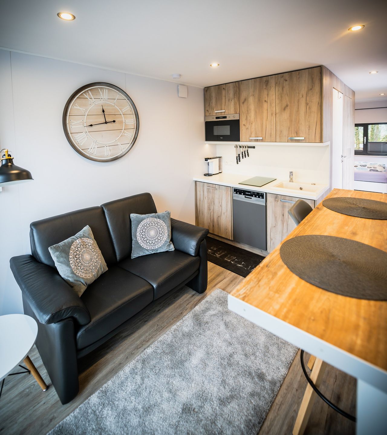 Der moderne Bungalow hat eine große, helle Fensterfront mit Terassentür. Die Holz-Terasse ist möbliert und komplett eingezäunt. Die Küche ist voll ausgestattet mit einem 2-Plattenherd, Mikrowelle, Kühlschrank mit Gefrierfach und einer Spülmaschine. Außerdem ist eine Kaffeemaschine, Wasserkocher und Toster vorhanden. Das Schlafzimmer hat ausreichen Einbauschränke und ein Doppelbett 140cm x 200m. Außerdem gibt es einen 2-Sitzer aus Leder und eine Essbar, Flachbild TV und WLAN. Ihr Auto können S...