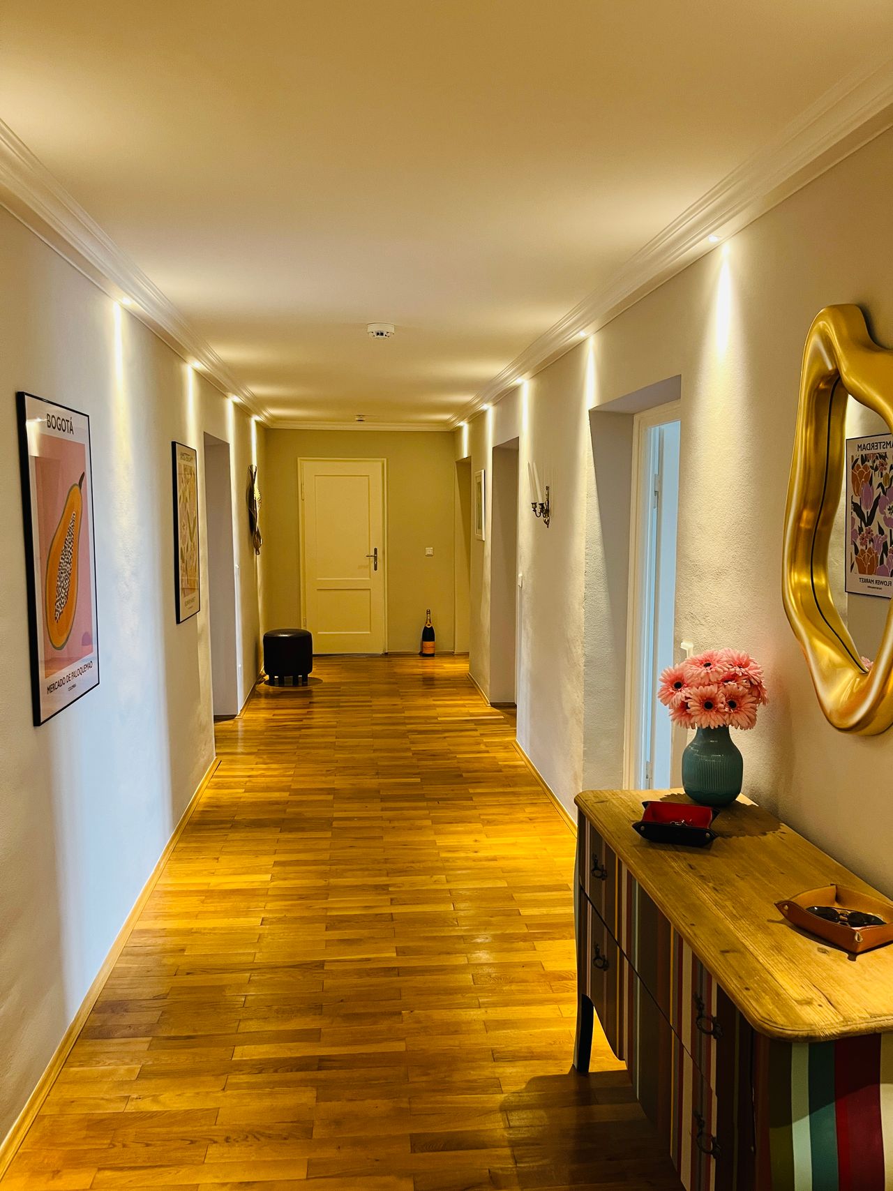 Die angebotene Wohnung befindet sich in einem 1903 gebauten Mehrfamilienhaus mitten in der beliebten und zentral gelegenen Maxvorstadt und ist nur wenige Gehminuten vom Hauptbahnhof entfernt. Die 123 qm große Wohnung bietet ein geräumiges Schlafzimmer mit großem Kingsize-Boxspringbett (2,20m x 2,20m), ein Arbeitszimmer, ein großes Wohn-Esszimmer, eine voll ausgestattete Küche mit Esstisch und angrenzendem Balkon, ein Gäste-WC und ein großes Badezimmer mit Badewanne und Dusche.