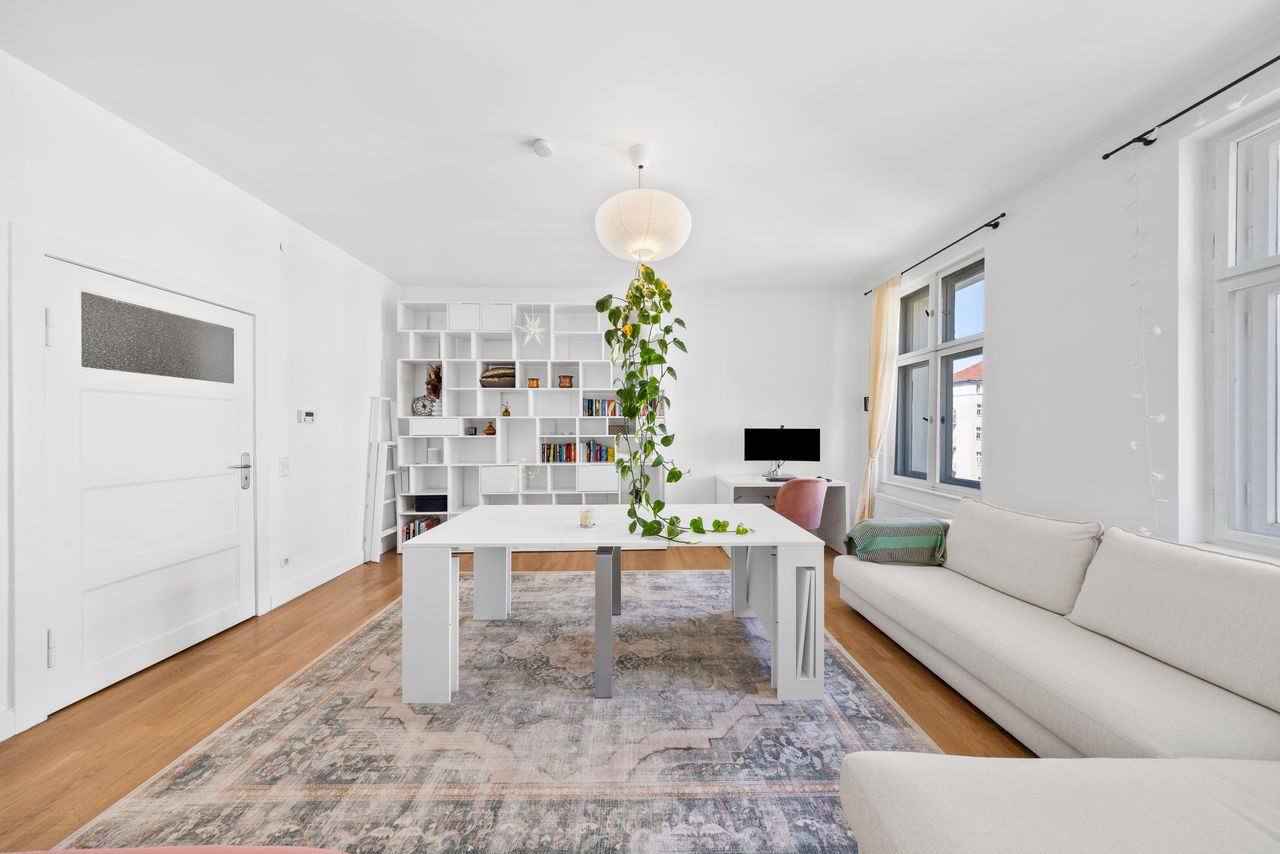Ideal für einen Expakt, der in die Stadt Berlin zieht. Zu vermieten ist diese charmante, sehr helle, geräumige Wohnung mit einem Balkon zum Innenhof. Das gesamte Haus wurde im Jahr 2012 komplett renoviert. Die Wohnung befindet sich in der dritten Etage, nachdem Sie die klassische Treppe hinaufgestiegen sind, betreten Sie die Diele. Von dort aus haben Sie Zugang zum Bad, zur Küche und zum Wohnzimmer. Das Schlafzimmer liegt zur ruhigen Seitenstraße. Die Wände sind 3,00 Meter hoch. Von der Küche ...