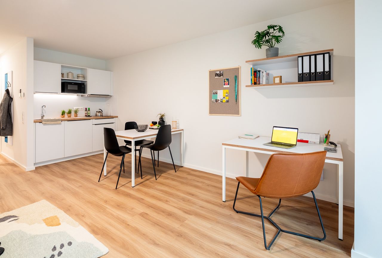 Brauchst du etwas mehr Platz zum Entspannen, dann findest du in unseren Apartments im 2025 fertig gestellten Gebäude auf 32 m² die ideale Kombination aus Komfort und Stil. Es erwarten dich ein einladendes Bett, ein Arbeitsplatz sowie ein zusätzlicher Essbereich zum Abhängen mit deinen Freunden. Die Pantryküche mit Mikrowelle, Glaskeramik-Kochfeld mit 4 Kochplatten und einem Kühlschrank mit kleinem Gefrierfach und das moderne Duschbad runden dein Wohnerlebnis ab. Wenn du noch mehr Raum benötigst,...
