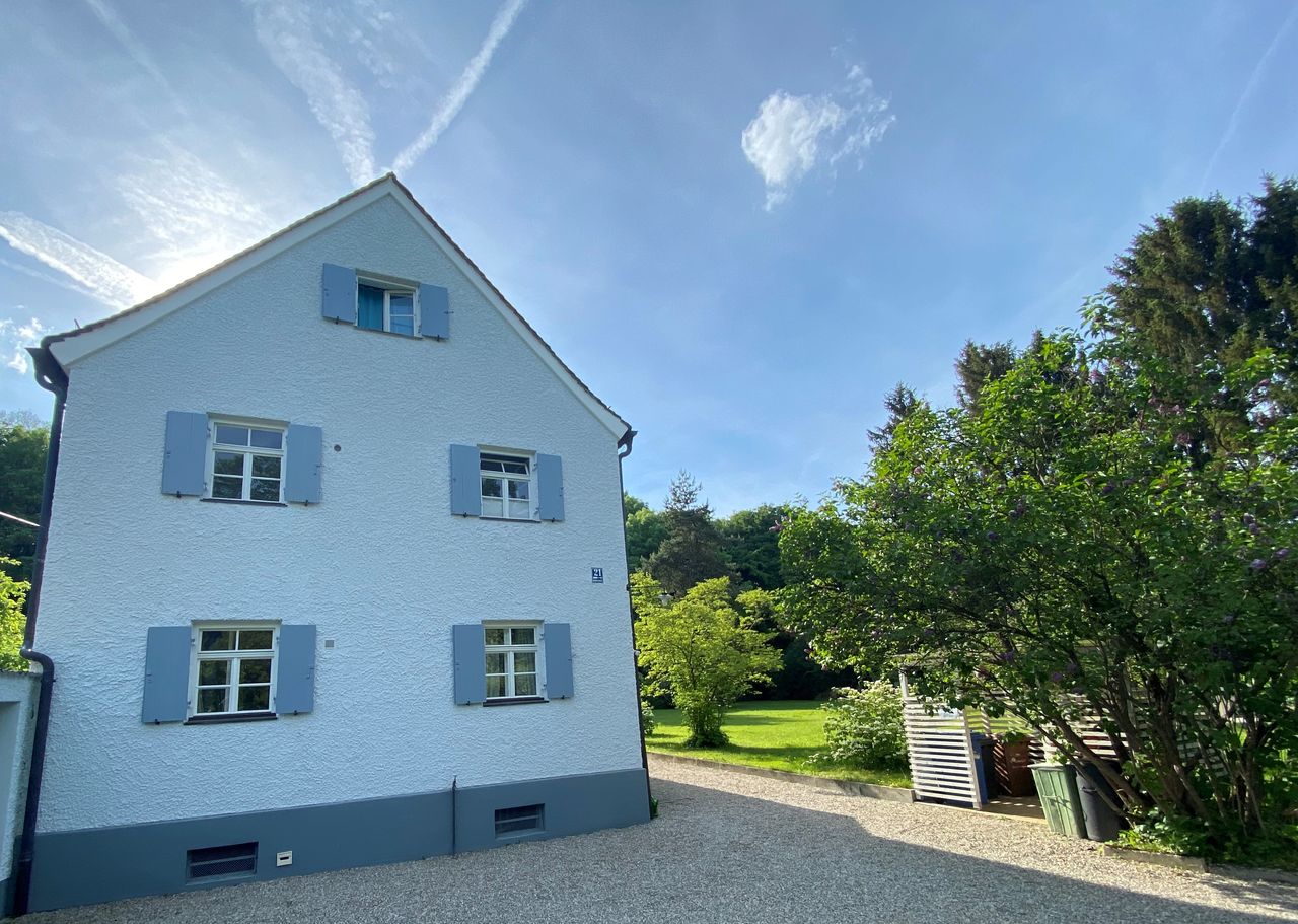Voll ausgestattetes helle Mansardenwohnung im 2. Stock eines gepflegten Altbaus (1930). Absolut ruhige Lage in Parkgrundstück am See, ausschließlich Blick in die Natur. Kleiner Flur mit Garderobe Geschmackvolles weißes Badezimmer mit Wanne und einzigartigem Blick ins Grüne, Handtücher und Vorleger Wohnküche mit voll ausgestatteter Einbauküche mit Kühl-/Gefrierkombination, Herd, Geschirrspüler, und Dunstabzug, Geschirr, Gläser und Töpfe, Wasserkocher. Tisch und Stühle als Essplatz Schlafzimme...