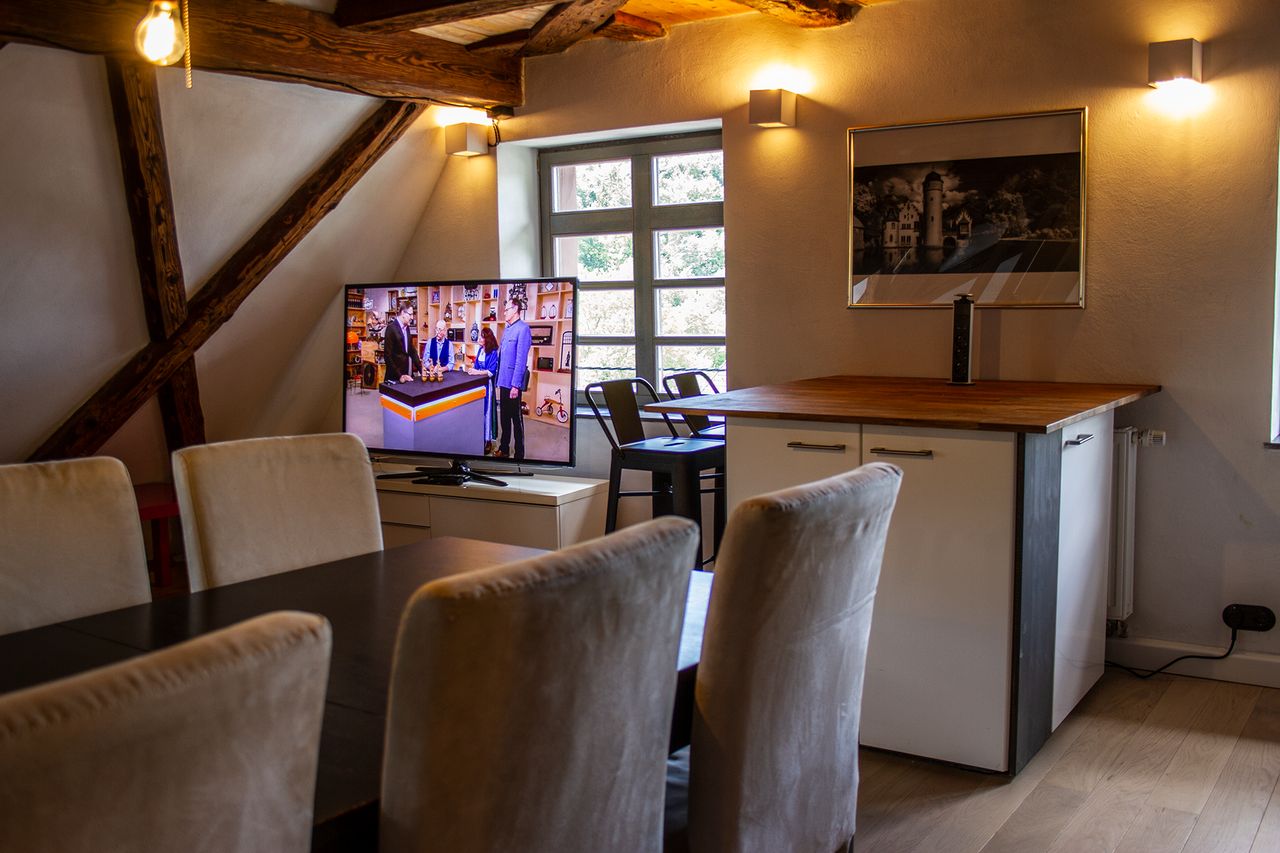 Wohnen auf Schloss Mühlen Zu dem Apartment auf 2 Ebenen zählen ein Schlafzimmer mit Doppelbett, eine Wohnküche mit Esstisch, ein Duschbad und auf der Galerieebene ein weiteres Schlafzimmer mit großem Doppelbett. Die Wohnung ist nach Süden und Norden ausgerichtet. Küche mit Gas- und Ceranfeld, Backofen, Geschirrspüler und Kühlschrank. Kombimaschine: Waschmaschine und Trockner. Wlan bis 50 Mbit in der gesamten Wohnung. Ebenerdige Dusche, Waschtisch aus geölter Eiche mit Natursteinwaschbecken.
