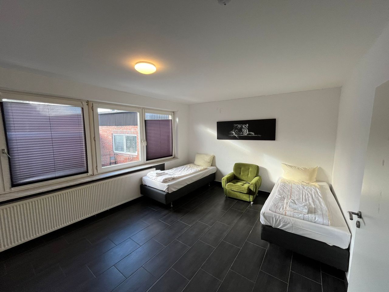 Diese großzügige Wohnung bietet komfortable Unterkünfte für Geschäftsreisende oder Gruppen. Mit mehreren Schlafmöglichkeiten, einer voll ausgestatteten Küche und zwei modernen Badezimmern eignet sie sich ideal für längere Aufenthalte. Die Schlafzimmer sind mit bequemen Einzelbetten ausgestattet. Der großzügige Wohnbereich ist modern eingerichtet und verfügt über einen Fernseher. Große Fenster lassen viel Tageslicht in die Räume, während Verdunklungsrollos für eine angenehme Nachtruhe sorgen. Di...