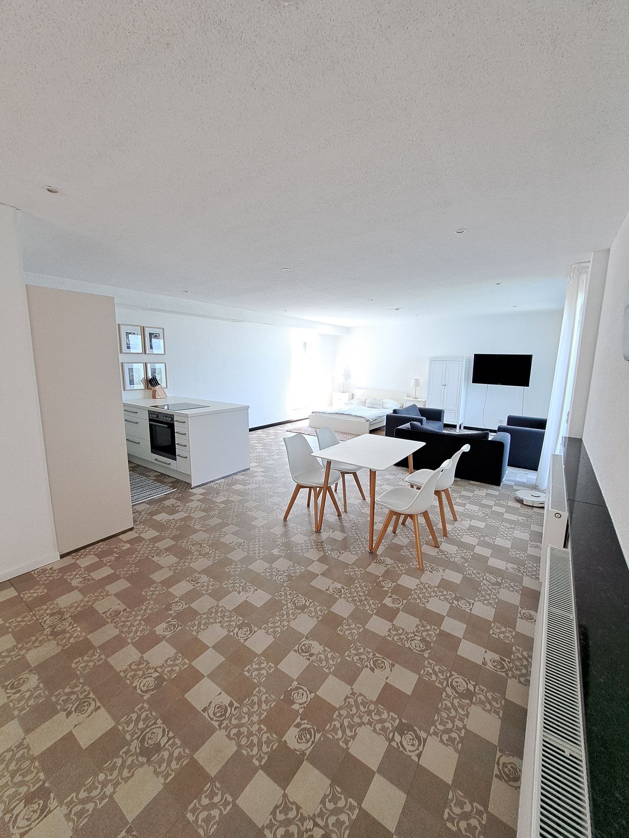 Das frisch renovierte und neu eingerichtete Loft verfügt über einen hellen Eingangsbereich mit Sitzmöglichkeit. Rechts das erste Bad mit WC & Waschbecken. Im zweiten Bad befindet sich die Dusche und eine Waschmaschine. Der großzügige Wohn- & Schlafbereich ist mit einem Bett, einem Kleiderschrank, einem Tisch mit 4 Stühlen und einem Fernseher ausgestattet. Zum Einzug wird noch fertig möbliert mit einer Couch, und einem weiteren Schrank. Das großes Fenster wird noch mit Milchglasfolie versehen un...