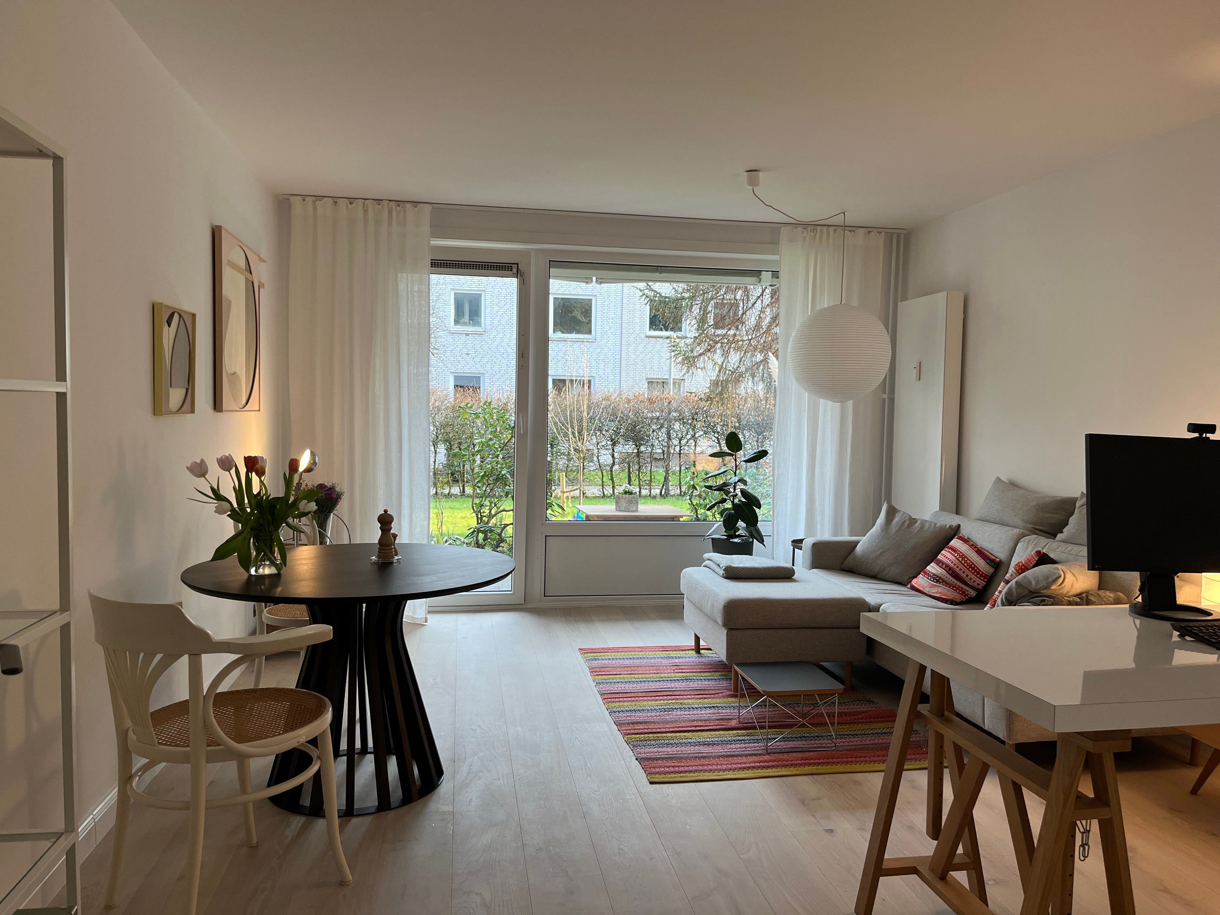 Stilvolle und vollständig möblierte 2-Zimmer-Wohnung mit Terrasse und Garten in ruhiger, grüner Lage in Hamburg-Jenfeld.