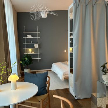 Vollständig möbliert, Designer-Beleuchtung und -Möbel, ein Schlafzimmer mit einem großen Wohn- und Küchenbereich (Prenzlauer Berg)