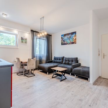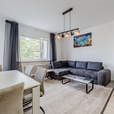 helle 2 Zimmer-Wohnung mit Blick auf grüne Gärten