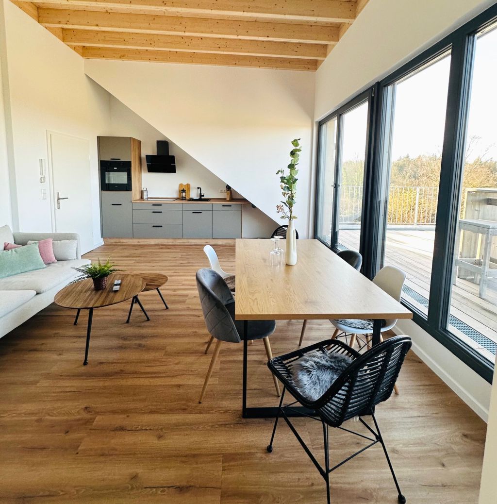 Dachgeschoss mit Terrasse und Fenstern in alle vier Himmelsrichtungen