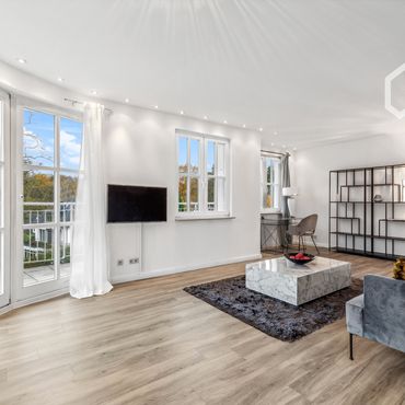 - Mehr als 200 SuchergebnisseDie 4-Zimmerwohnung im 1. Obergeschoss mit Pitchpine-Boden, beeindruckt gleich beim Betreten durch seine exklusive Einrichtung mit Designklassikern. Hohe Decken, fein verputzte Wände, historische Stilelemente wie beispielsweise Stuck, Schiebetür zwischen Wohn- und Esszimmer sind meisterhaft aufgearbeitet.