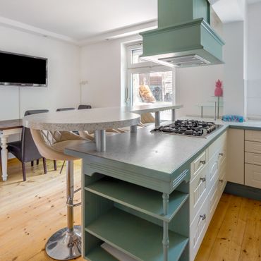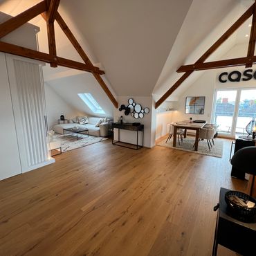 - Mehr als 200 SuchergebnisseDie 4-Zimmerwohnung im 1. Obergeschoss mit Pitchpine-Boden, beeindruckt gleich beim Betreten durch seine exklusive Einrichtung mit Designklassikern. Hohe Decken, fein verputzte Wände, historische Stilelemente wie beispielsweise Stuck, Schiebetür zwischen Wohn- und Esszimmer sind meisterhaft aufgearbeitet.