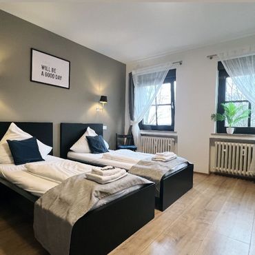 Gemütliches Zweibettzimmer mit eigenem Bad und Zugang zur Gemeinschaftsküche