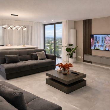 Modernes Designer-Loft mit Panorama-Essbereich, ideal für Teams & Familien
