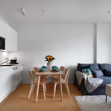 Luxuriöse 2-Zimmer Wohnung bei Frankfurt Messe mit Concierge, Balkon, offener Küche, Badewanne und Stellplatz