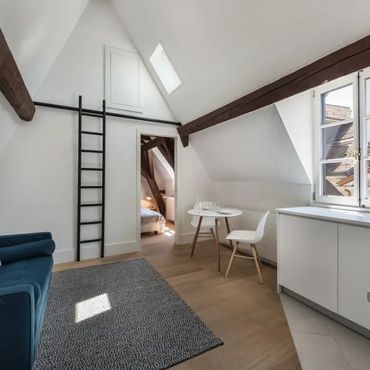 Dachgeschoss-Studio mit sichtbaren Balken im historischen Zentrum von Genf