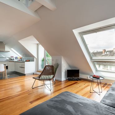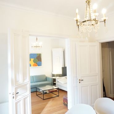 - Mehr als 200 SuchergebnisseDie 4-Zimmerwohnung im 1. Obergeschoss mit Pitchpine-Boden, beeindruckt gleich beim Betreten durch seine exklusive Einrichtung mit Designklassikern. Hohe Decken, fein verputzte Wände, historische Stilelemente wie beispielsweise Stuck, Schiebetür zwischen Wohn- und Esszimmer sind meisterhaft aufgearbeitet.