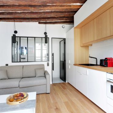 Elegant 26m² studio with equipped kitchen, bathtub, and storage, near transportation