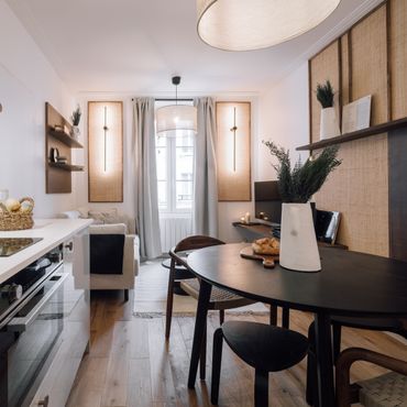 Elegant 26m² studio with equipped kitchen, bathtub, and storage, near transportation