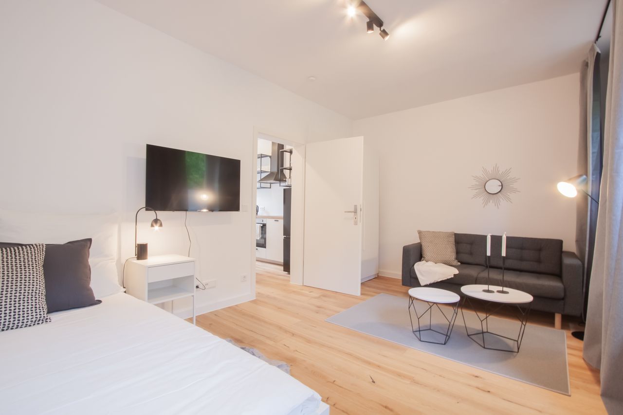 Diese Wohlfühlwohnung wurde im Jahr 2022 umfassend saniert und liebevoll möbliert. Alle Räume sind vollausgestattet und bieten alles für den alltäglichen Gebrauch. Die separierte Küche verfügt über Kochutensilien, Backofen, Ceranfeld, Geschirrspülmaschine, Wasserkocher, Dunstabzugshaube, einer Kaffeemaschine und einer Tisch-Stuhl Kombination. Der großzügige und durch 3 Fenster Lichtdurchflutete Wohn-/Schlafbereich ist mit einem gemütlichen Bett, einem Kleiderschrank, einer Sitzgelegenheit und ...