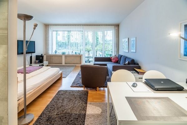 Das charmante Studioapartment mit Blick ins Grüne punktet mit intelligenter Raumaufteilung und sonniger Terrasse, die in einen großen Garten führt sowie mit einem separaten Anzieh- und Schrankzimmer neben dem Eingangsbereich. Dieses Apartment verfügt über einen geräumigen Wohnbereich mit einer Sitzecke zum Arbeiten und zum gemütlichen Essen, ein Doppelbett, Flatscreen-TV sowie ein gemütliches Schlafsofa. Die helle und ausgestattete Küche mit Kühlschrank und einer Waschmaschine bietet alles, wa...