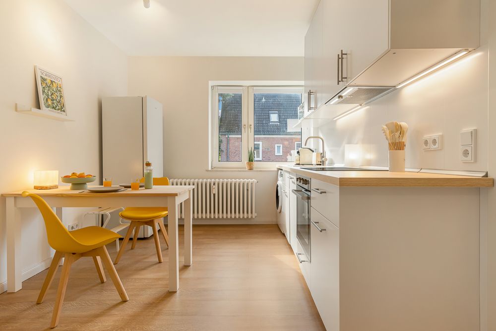 Die schöne hochwertig sanierte und sehr gut aufgeteilte 2,5-Zimmer-Wohnung befindet sich im 1. Obergeschoß eines sehr gepflegten Mehrfamilienhauses in ruhiger Lage in Kiel-Ellerbek aber dennoch zentrumsnah (10 min entfernt). - Vollständig renoviert / saniert - Komplett möbliert und ausgestattet inkl. sämtlichem Zubehör - Effiziente Raumaufteilung und Grundriss - Größe und funktionale Wohnküche sowie geräumiges Schlaf- sowie Arbeitszimmer - Saniertes Badezimmer mit Badewanne, Regendusche und H...