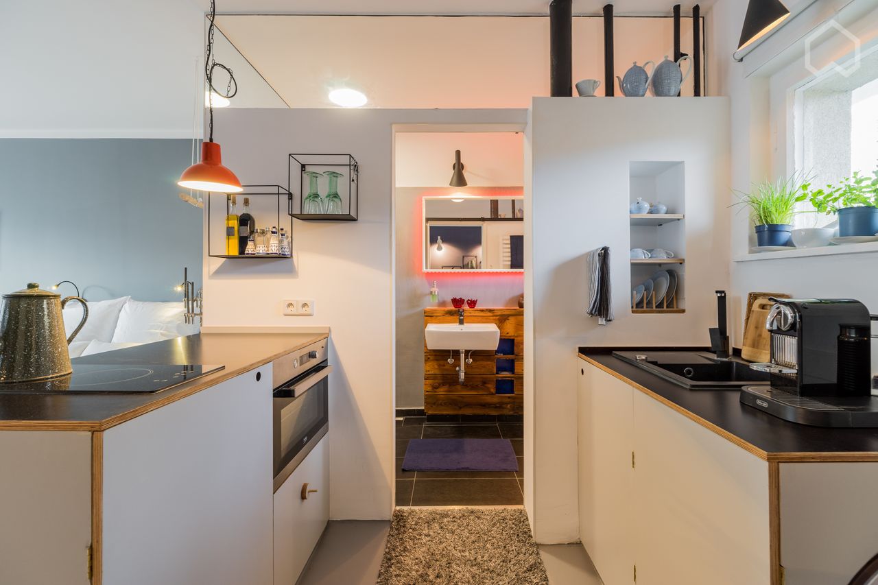 Do you like the 60ies? Dieses Studio aus dem Jahr 1958 ist endgültig im hier und jetzt angekommen. Es wurde 2019 komplett saniert und auf heutige Anforderungen umgestellt. Die Küche ist offen im Raum und störende Wände sind entfernt worden. Das Badezimmer ist ein nach oben verglaster Kubus. Die Dusche ist ebenerdig und durch die Form des Badezimmers recht groß. Auf Fliesen an der Wand ist völlig verzichtet worden, bis auf eine eingearbeitete Fliese aus einer Künstlerwerkstatt auf die wir besonde...