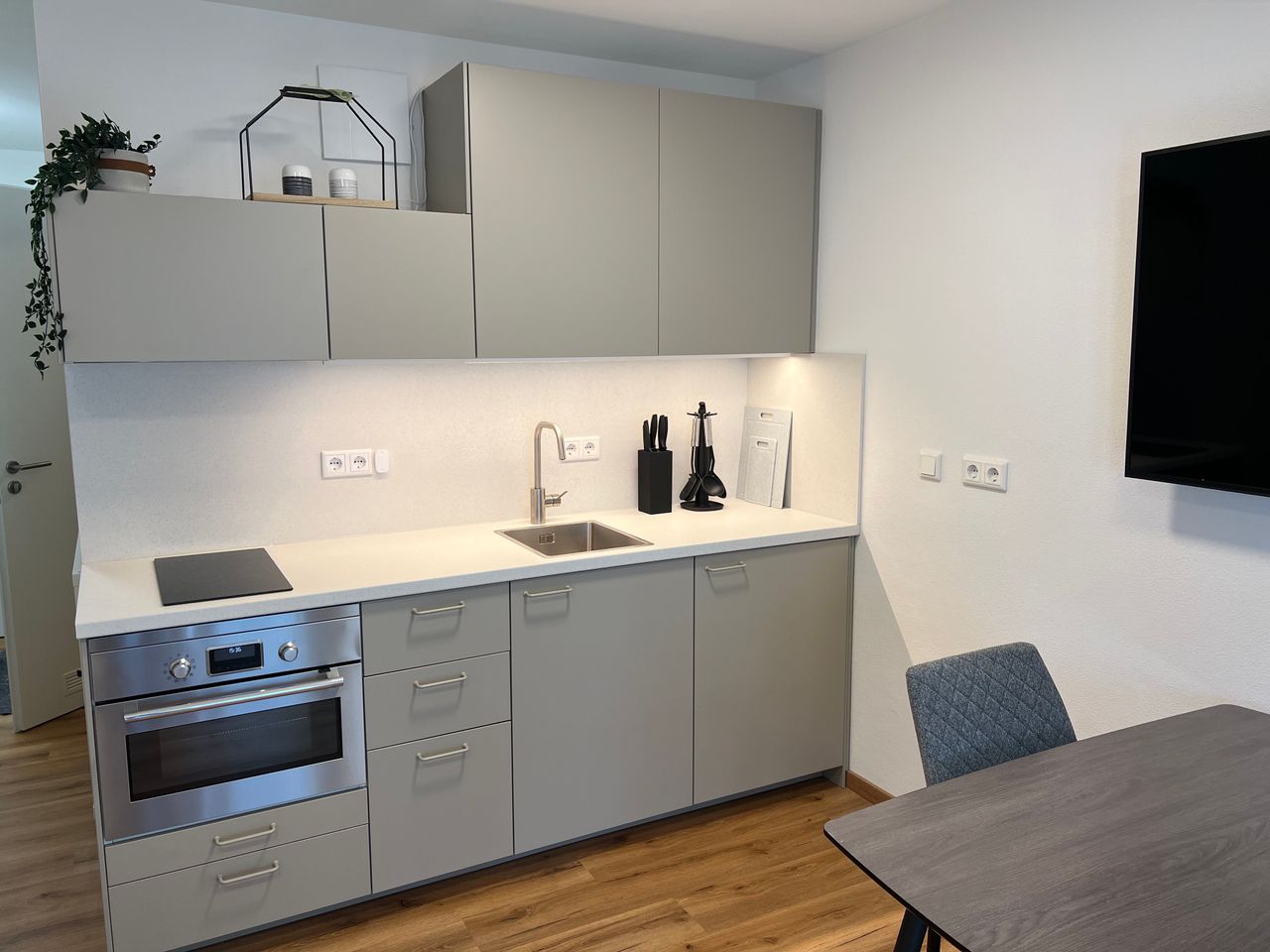 Ausstattung: - Neubau, Erdgeschoss - Terrasse mit Gartenmöbel & Überdachung - Tiefgaragen-Duplex-Stellplatz direkt unter der Wohnung - Kellerabteil mit Regalsystem - Videosprechanlage - Akku-Staubsauger Wohnen & Schlafen: - Einzelbett mit Matratze, Kissen, Decke, Bezüge - 55" Smart-TV mit flexibler Wandhalterung - Ess-/Schreibtisch (120 × 80 cm) - 2 Stühle - PAX-Kleiderschrank (H 236 x B 200cm) - KALLAX-Regal, Garderobe - Pflanze (pflegeleicht, luftreinigend) Küche (IKEA): - Große Küchenzeile ...