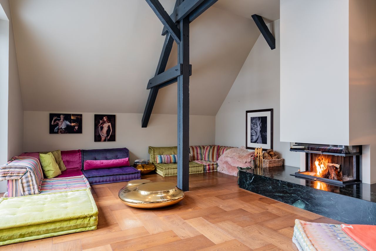 Freigelegte Dachbalken, großzügige Oberlichter und warmer Fischgrät-Eichenboden schaffen eine lichtdurchflutete und zugleich private Atmosphäre. Der offen gestaltete Wohn- und Essbereich mit integriertem Kamin bildet das Herzstück des Penthouses. Eine maßgefertigte Küche mit Natursteinoberflächen, hochwertigen Geräten sowie einer großzügigen Arbeits- und Barfläche fügt sich nahtlos in das architektonische Gesamtkonzept ein. Großzügige Schiebeelemente aus Glas öffnen sich direkt zur weitläufigen ...