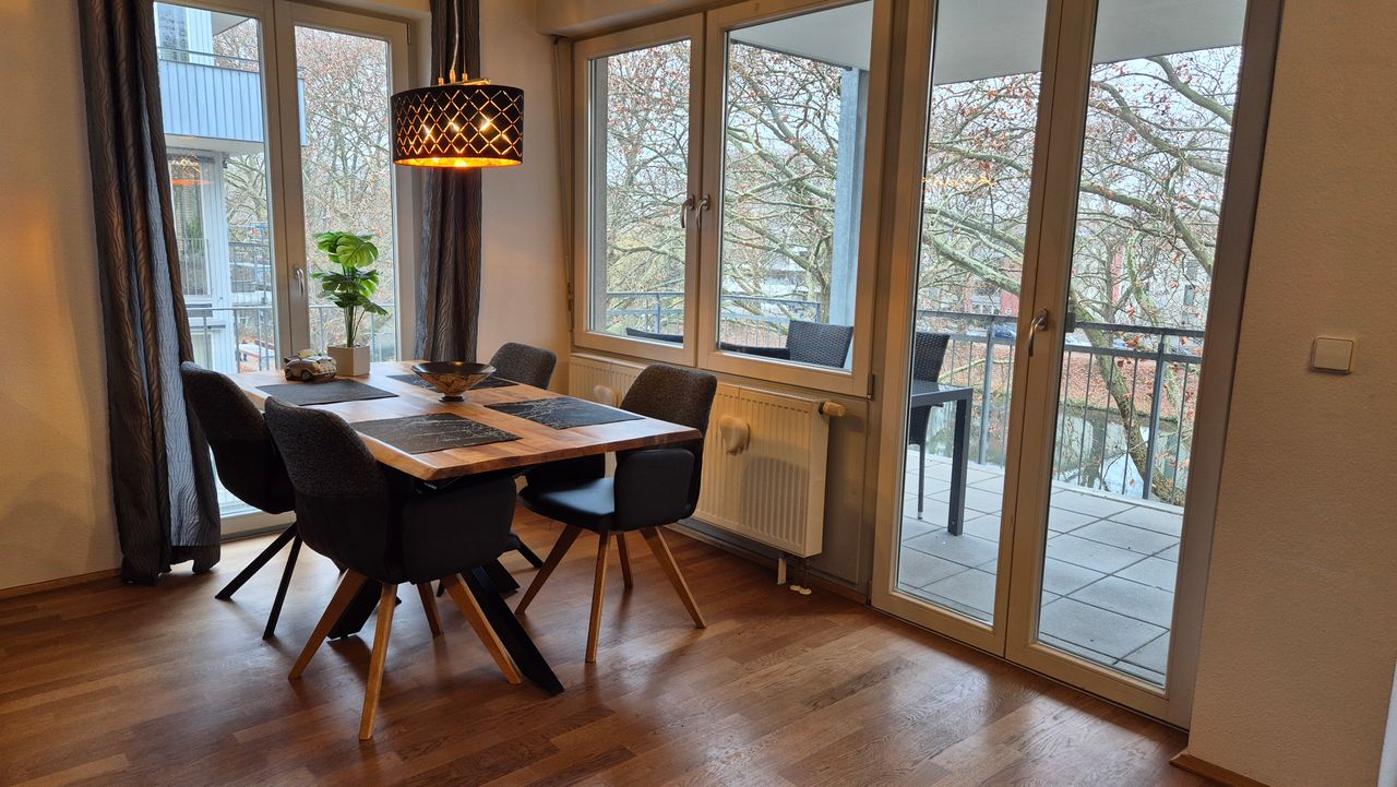 Diese exklusive und voll ausgestattete Wohnung im 1. Obergeschoss bietet Ihnen höchsten Wohnkomfort in einer der besten Lagen von Heilbronn mit einer traumhaften Aussicht auf den Neckar. Ideal für Expats - einfach Koffer mitbringen und einziehen! Highlights der Wohnung: - großer, sonniger Balkon mit überdachtem Freisitz und beeindruckendem 180°-Blick auf den Neckar - großzügiges Wohn-/Esszimmer mit offener Küche und direktem Zugang zum Balkon - gemütliches Schlafzimmer mit Blick auf Neckar und P...