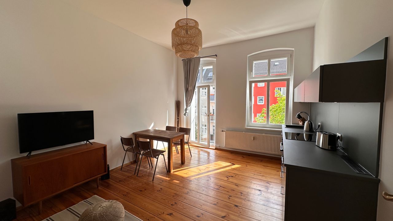 Schöne 2 Zimmer Altbauwohnung. Die Wohnung ist komplett mit stylischen Möbeln ausgestattet. In einem klassisch schönen Altbau. Das gesamte Gebäude wurde vor wenigen Jahren liebevoll kernsaniert. Diese Wohnung liegt im Vorderhaus. Schöner Parkettboden oder Holzdielen Boden in allen Räumen. Glattputz an den Wänden . Das Badezimmer ist mit Badewanne ausgestattet. Die Wohnung verfügt über eine schicke Küchenzeile im Wohnzimmer.