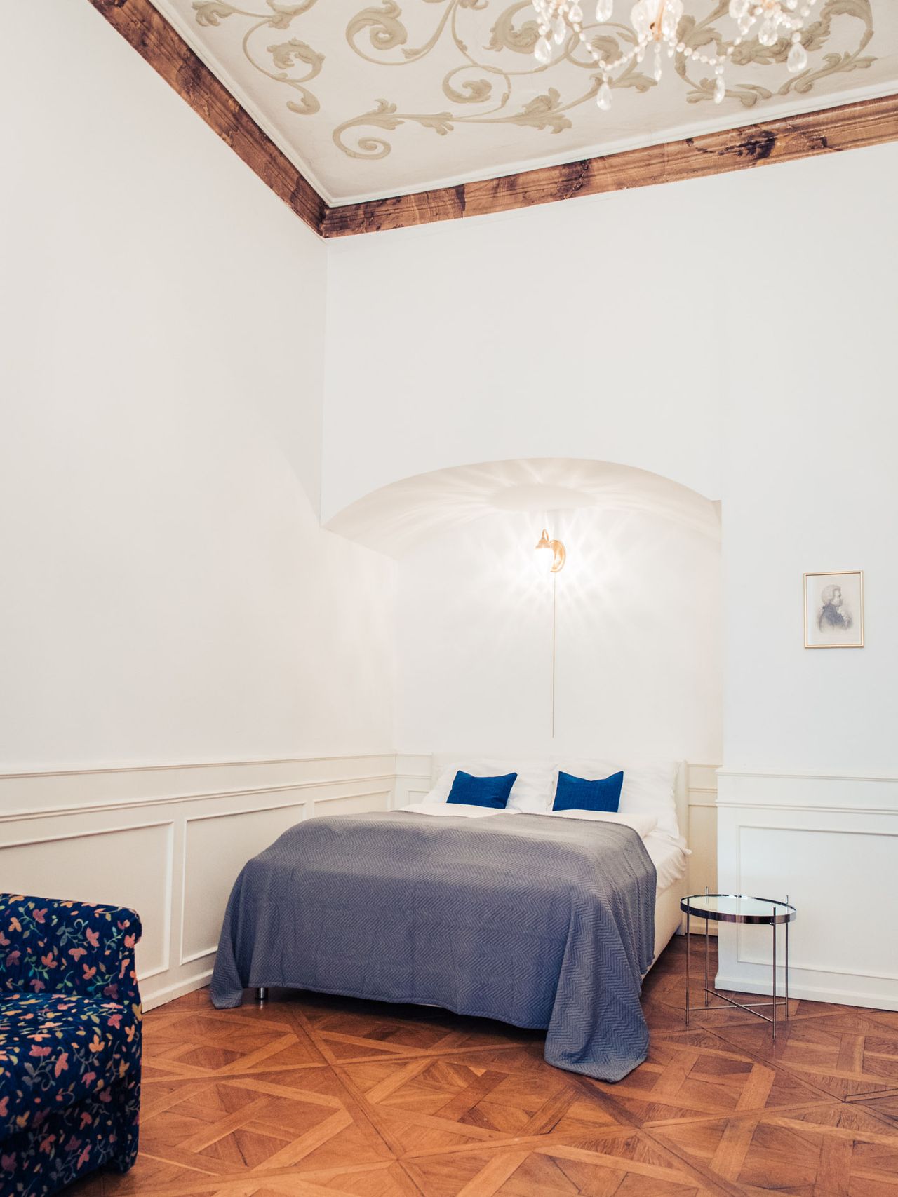 Das Apartment befindet sich im 2. Stock eines gepflegtes Barockhauses in einer ruhigen Seitengasse, im Stadtztentrum. Das Apartment verfügt über teilweise Fussbodenheizung, Stilmöblierung, Marmor-, Fliesen- und Parkettboden. Das Wohn-/Schlafzimmer verfügt über eine historische Deckenbemalung. Ausstattung: Wohn-/Schlafraum Bett 150x200cm Sitzbereich Schreibplatz Esstisch Flatscreen Stereoanlange historisches Tafelparkett Deckenfresko Bad Badewanne Bidet...