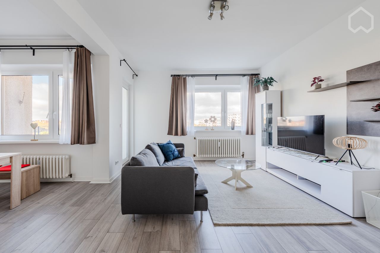 Die Wohnung ist sehr hell und ruhig und bietet einen schönen Ausblick aus dem 5. Stock. Das Wohnzimmer ist groß und verfügt über einen Essbereich und einen Arbeitsplatz. Der Übergang zur Küche mit moderner Einbauküche ist offen gestaltet. Der großzügige Balkon, der gerne bepflanzt werden darf, bringt eine schöne Atmosphäre mit sich. Das kleine Schlafzimmer bietet ein Doppelbett von 1,60m Breite. Mit der Bushaltestelle gegenüber besteht eine gute Anbindung an den öffentlichen Nahverkehr, die U-Ba...
