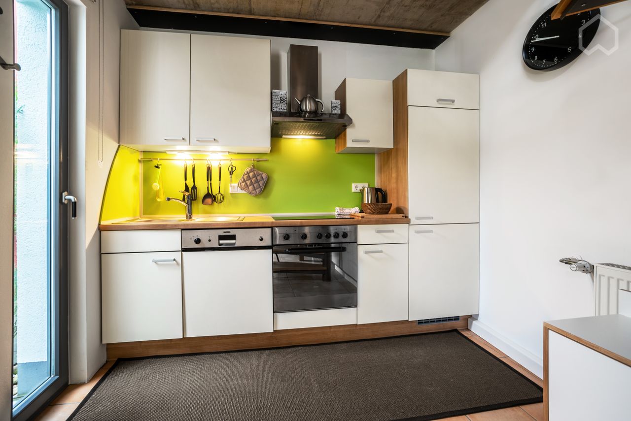 *English* Furnished flat in Darmstadt/ Eberstadt The apartment is furnished in loft style, small terrace. Ground floor with kitchenette, dining table and sofa. 1st floor with desk, double bed, wardrobe, separate daylight bath with underfloor heating and shower. Equipment: TV with SAT connection, wireless LAN, HiFi system, towels and bed linen are available. Every 14 days there is a cleaning included in the rent. Central residential area in Darmstadt-Eberstadt with direct motorway connection, tra...