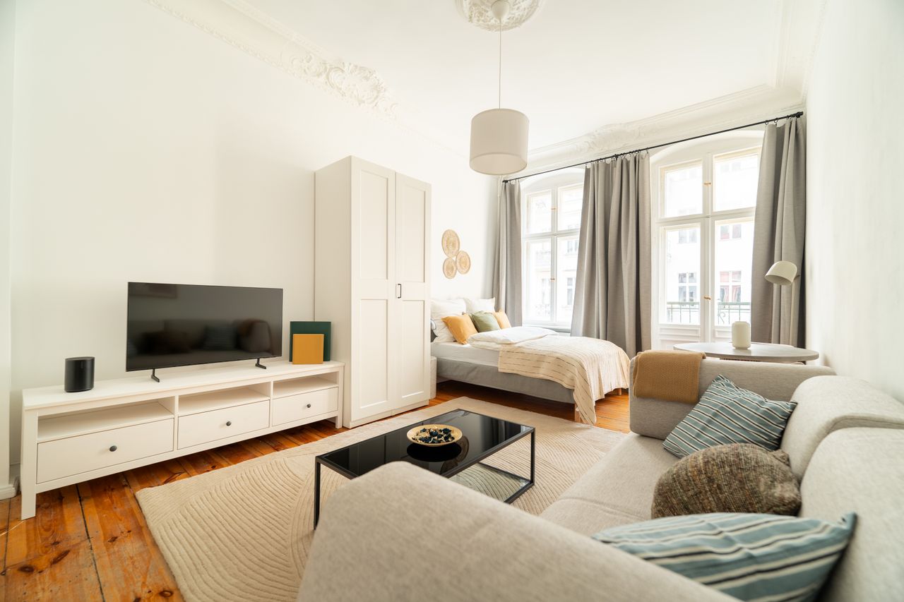 Dieses eindrucksvolle, möblierte Studio Apartment bietet modernes Design, eine voll ausgestattete Küche und einen gemütlichen Wohnbereich mit traumhafter Aussicht. Perfekt gelegen, hast du einfachen Zugang zu allem, was Berlin einzigartig und spannend macht!