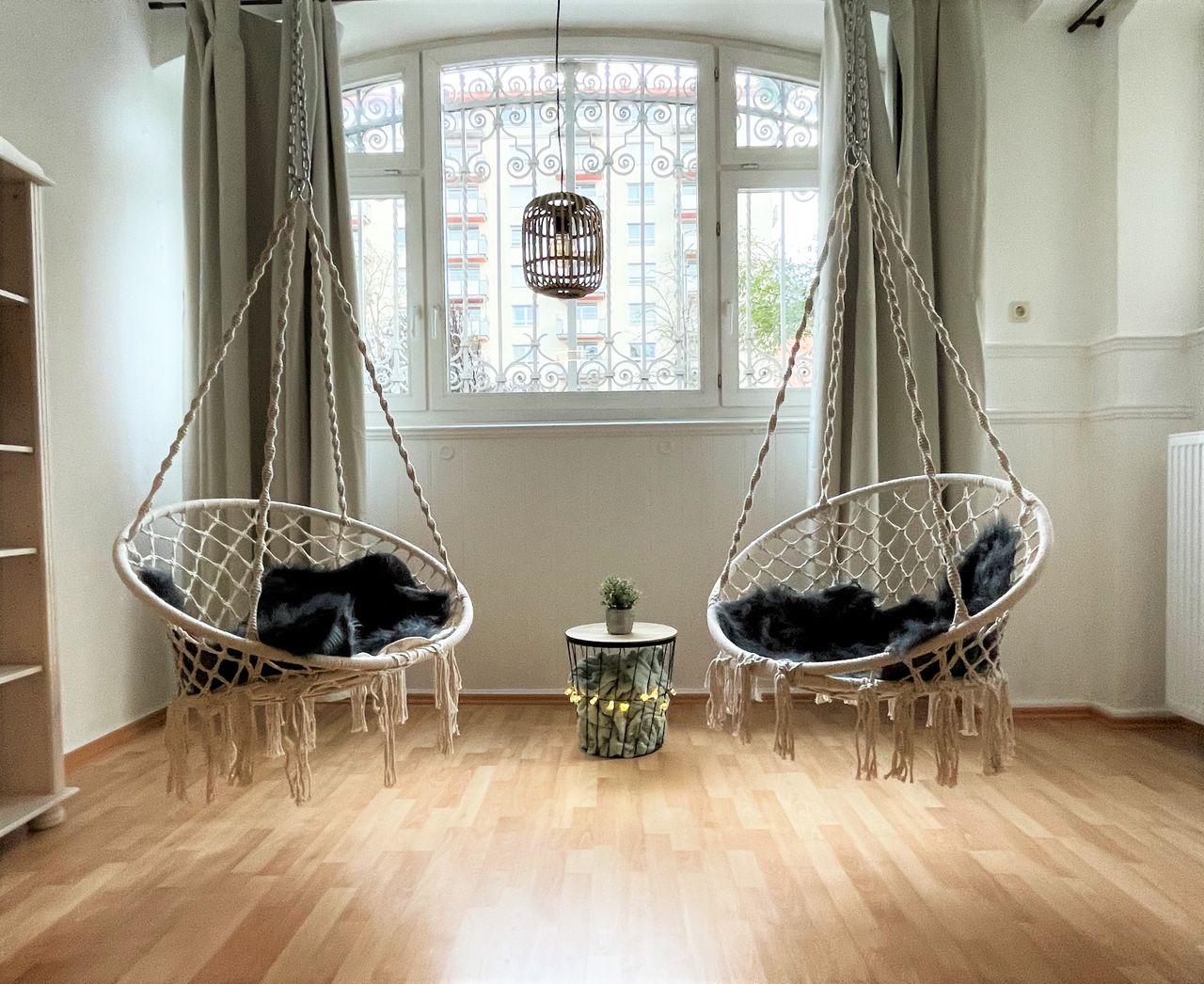 In der Wohnung gibt es ein gemütliches Schlafzimmer ausgestattet mit einem großen und bequemen Betten (1,8mx2m), einem Kleiderständer und einer schönen Erkerecke mit zwei Hängesesseln mit kuscheligem Kunstfell und einem Bücherregal. Im Wohnzimmer steht eine extravagante Schalfcouch, die sich einfach ausziehen lässt. Das Sofa gehört zu einer gemütlichen Sitzecke mit zwei Samthockern. Darauf ist der 55" Smart-Fernseher ausgerichtet und lädt zu gemütlichen Filmabenden ein. In der Küche findes...