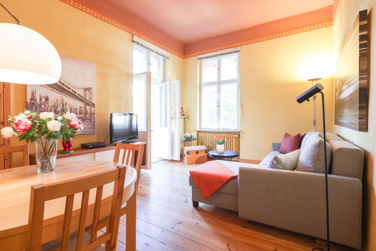 Die Altbauwohnung mit Stuck liegt im Seitenflügel der 3. Etage. Die Aufteilung ist: Wohn- Esszimmer mit Ecksofa, TV, Esstisch und direktem Zugang zum Balkon mit Grünblick, Schafzimmer mit Doppelbett 140 x 200, diversen Kleiderschränken mit viel Stauraum liegt zum ruhigen Innenhof. Die Fenster können verdunkelt werden. In der Einbauküche fehlt es an nichts. Die Wohnung verfügt über ein Duschbad. und hat einen sehr gepflegten Holzdielenboden Die verkehrsgünstige Lage hat eine gute Anbindung dire...