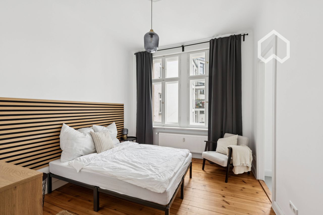 Dieses 18 m² große Zimmer ist hell, geschmackvoll möbliert und ideal für alle, die ein stilvolles Zuhause im Herzen Berlins suchen. Es besteht aus einem Hauptzimmer und einer nur von diesem Zimmer zugänglichen Ankleide, die zusätzlichen Stauraum und ein praktisches, privates Extra bietet. Die Einrichtung kombiniert modernes Design mit gemütlichen Elementen und schafft eine angenehme Atmosphäre. Die 128 m² große Wohnung befindet sich im 3. Obergeschoss eines klassischen Berliner Altbaus mit hoh...